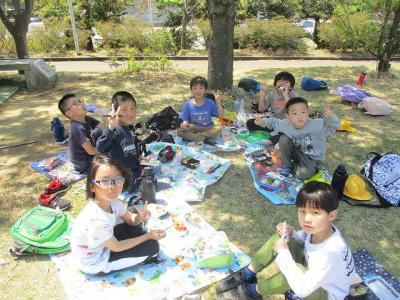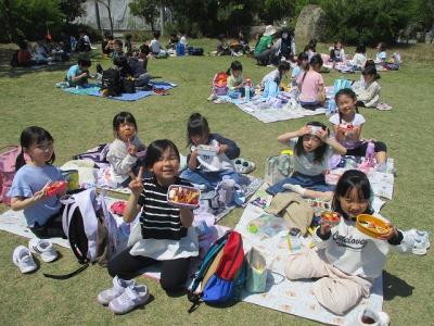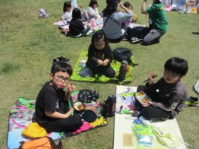 道中は、1年生と2年生で手をつなぎ、安全に楽しく歩きました。 公園に着くと、1年生も2年生も一緒になって、 おにごっこをしたり遊具で遊んだりと仲良く遊んでいました。 お昼には、おいしいお弁当を食べ、 それぞれが笑顔いっぱいで過ごすことができました。