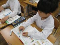 今日は4年生。「Do you like~?」に対して「Yes」「No」と元気よく答えながら、英語の絵本に入り込んでいました。