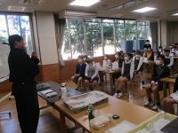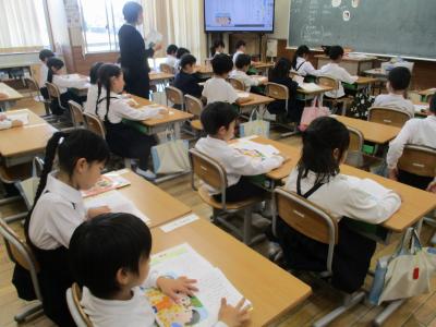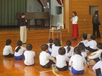 地震に続いて、津波から身を守る避難訓練を初めて実施しました。本校の校舎は海面から25メートルの高さにあります。避難訓練の計画段階では、何度もどのように避難するかを練り直しをして訓練日を迎えました。地震発生の緊急放送で、児童はいっせいに机の下にもぐって頭や体を守る体制になり、揺れがおさまるのを待ちました。その後、津波発生との放送で、全児童が校舎2階に避難しました。初めての経験でしたが、静かにすばやく避難することができました。訓練後は教室にもどり、放送とDVDで津波の恐ろしさと避難の仕方を学習しました。今日学習したことをおうちでも家族の皆さんに教えてくださいと伝えましたが、子どもたちは話したでしょうか。
