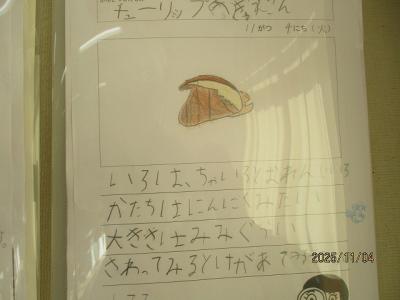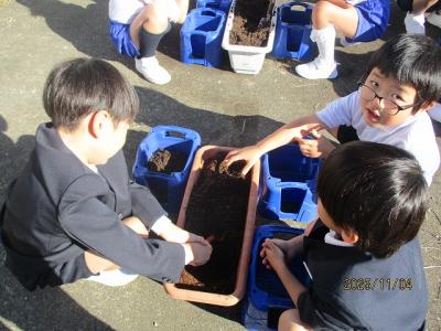 植える前には、球根をじっくり観察。入学当初より観察力もぐっとのびました!五感をしっかり使って上手に表現していました。