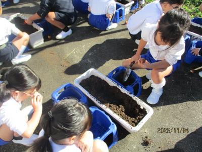 今日、子ども達はチューリップの球根を植えました。夏は朝顔がきれいに咲いていたプランターに、土を入れ替えて、ていねいに球根を植えました。寒い冬を乗り越えて、春には色とりどりのチューリップが1年生のベランダを飾ることを想像して、わくわくしているようすでした。