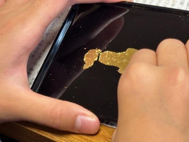 金箔をそうっと貼っていきます。金箔は、何と1万分の1㎜の薄さ!