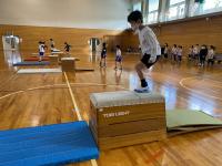 今日の体育の時間に跳び箱遊びをしました。跳び箱を使っていろんな遊びに挑戦しました。