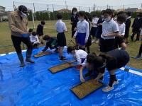 苗箱に土を入れ、ならし、稲の種であるもみを植えて、土を入れました。その苗箱に温度調節のためにビニールをかけ、お水をたっぷりと与えました。実際に一人一人が進んで取り組む姿が見られました。