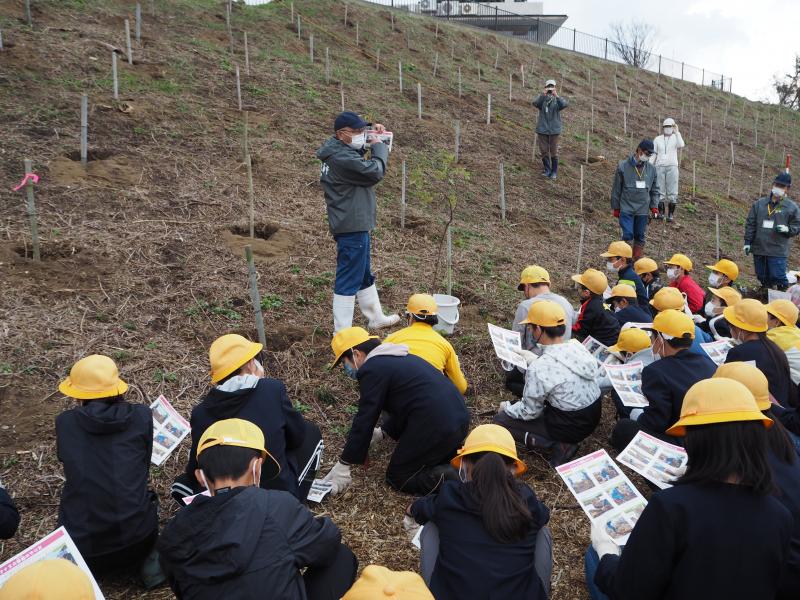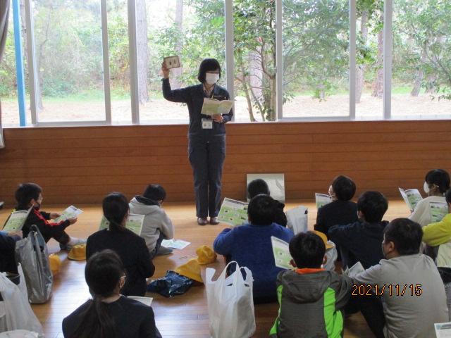 11月15日(月)、5年生が町花でもある「ハマナス」の植樹体験をしてきました。まずは、学校でハマナスについてのお話を聞きました。私たちの学校の校章にも使われているハマナス。今は準絶滅危惧種に指定されており、貴重な存在になっているそうです。