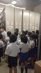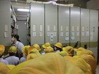 次に、普段入ることができない書庫に案内していただきました。本がたくさん並べられていることや、棚がハンドルで動くことにびっくりしていました。