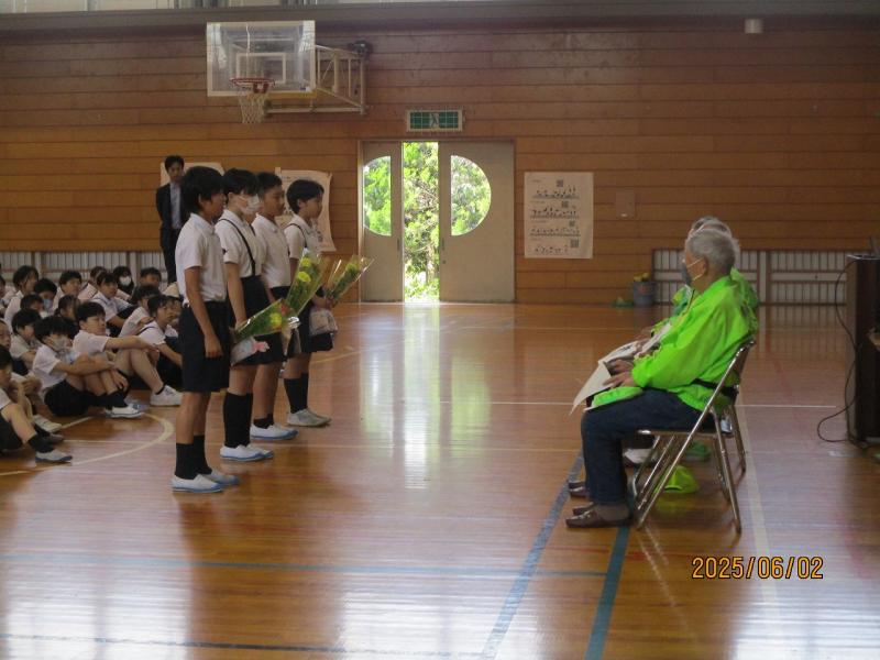 今日は、防犯ボランティアの方々との対面式がありました。いつも子ども達の安全を見守ってくださりありがとうございます。毎朝あいさつしているボランティアさんが自己紹介しているとき、「〇〇さんだ!」と言って嬉しそうな顔をしている友達がいました。校長先生からは2つの安全を見守ってくれているお話がありました。「交通事故から守る」「不審者から守る」安心して登校できるのも、ボランティアさんのおかげですね。これからもよろしくお願いします。