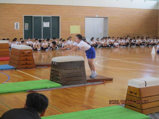 6月4日内灘町器械運動交歓会が開催されました。これまで「魅せる姿」を目指し練習を頑張ってきた4年生。本番では一人一人が練習の成果を充分に発揮することができました。