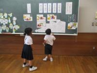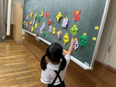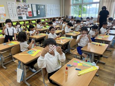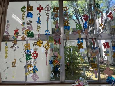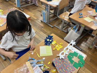 図工で「ちょきちょきかざり」をしました。紙を折ったり重ねたりしながら、はさみで切ります。 折った紙を開いてみると、素敵な飾りができます。 学習のゴールでは、 さまざまな飾りを一つの凧糸につなげてみました。 夢中になってちょきちょき、かざりタワーの完成です! 作った作品は教室の窓に飾り、鑑賞しました。