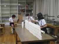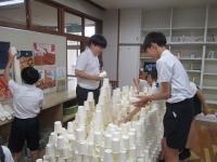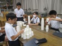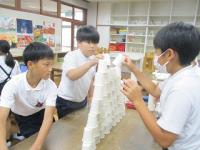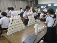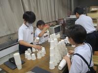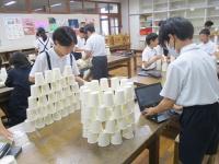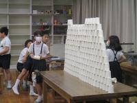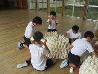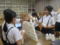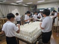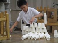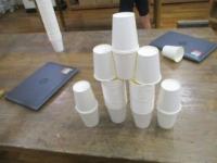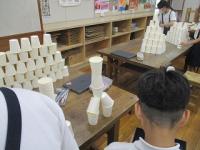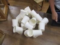 紙コップを切ったり折ったりせずに作品を作りました。「積み上げる」「並べる」「重ねる」などの意見が出たので、まずは、50個をどう使うか1人1人が考えて実際にやってみました。思いつくままにそれぞれの作品を仕上げていました。