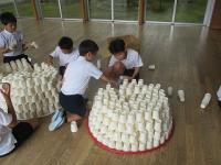 次は、もっとたくさんの紙コップを使って、さらに発想を広げていきました。高く積み上げたり、広げたり、カーブを作ったり、フラフープの中に積み上げてみたりと素敵な作品がたくさんできました。