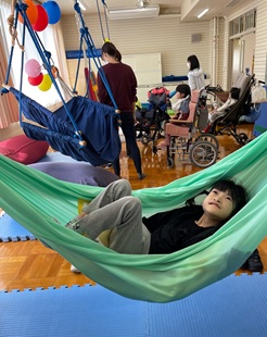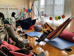 自立活動室にブランコやハンモックをたくさん集め、好きな揺れ遊びを楽しみました。