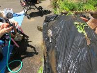 大きな紙に、長いローラーや釣り竿型の道具を使って色をつけました。