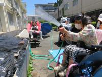 木箱型の畑に一人ずつ苗を植え、「大きくなあれ」とホースで水まきをしました。