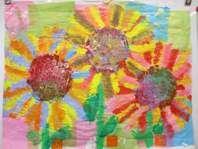 お花紙を貼ったり、いろんなものをスタンプのように押したり、刷毛を使って力強い線を描いたり、手形や足型をとったり…