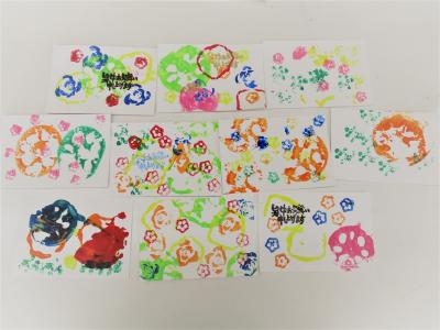 小学部の生活単元の授業でピーマンやオクラなど、夏野菜の野菜スタンプを使って暑中見舞いを作りました。