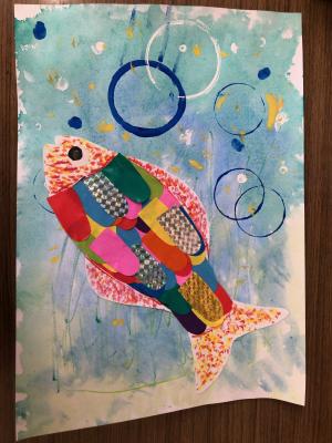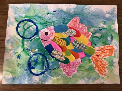 背景はクレヨンで水草を書いて、その上から青、水色、緑、黄緑の絵の具を混ぜて塗り、