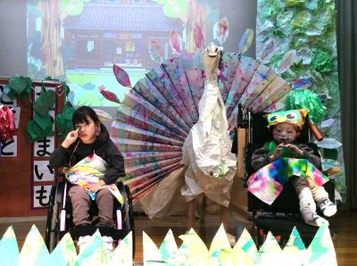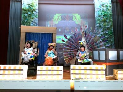 今年の小学部劇は、絵本『ふくろうのそめものや』を瀬領版にアレンジして上演しました。羽の白いクジャクのためにふくろうたちが色集めにでかけ、最後はクジャクの羽をきれいに染めるお話です。カブッキーランド、畑、駅へ色探しに出かけたふくろうたちがそれぞれの色をゲットし、最後はくじゃくの羽を8色の色に染めることができました。