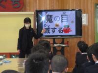 5日(水)全校集会を行いました。校長先生からは、目標達成をめざしてがんばることの大切さや「心の中の鬼」を退治することについての話がありました。心の中の鬼とは、「遅寝遅起き鬼」「食べ物好き嫌い鬼」「散らかし鬼」「いじわる鬼」「危険鬼」などの10の鬼です。子供たちは、「その鬼は退治している。それはまだ・・・・」など反応しながら聞いていました。10の鬼全部退治したいですね。