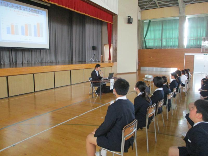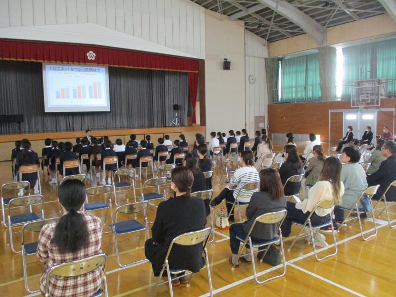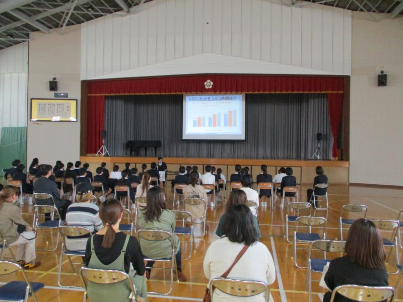 11月2日(木)5・6年生、保護者対象のスマホ・携帯安全教室がありました。小学生においてもゲームのみならず、YouTubeの視聴時間がかなり長くなっているということで、そのルール作りの必要性を感じました。これらのものは、子供だけでは、やめることができないように作られているので、正しく使うためには、親子で協力することが必要だということでした。