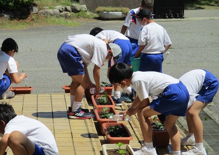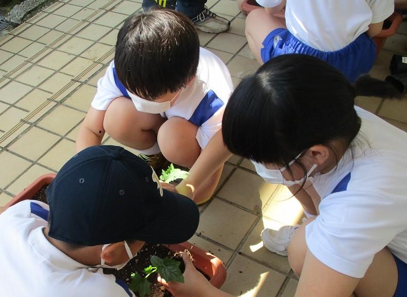 今日は,理科の時間にヘチマときゅうりの苗を植えました。理科の勉強に使うだけでなく,