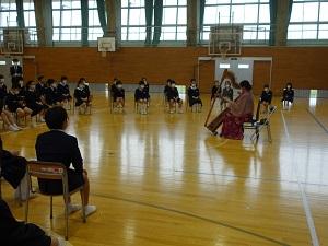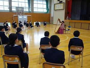 ハープ奏者の琴平メイさんをお招きし,低・中・高の3回に分け,ハープ演奏の観賞会を行いました。ハープはエジプトが起源であること,琴平さん自身はJICAの活動で南米へ行き,そこでハープを教えられていたことなど,たくさんのお話をしていただきながら演奏を聞きました。また,僅かではありませすがハープにも触らせていただきました。この体験が,子ども達の将来につながり,外国の文化へ興味をもったり,楽器へ興味をもったりという方向に働いたら,とてもすてきだなと思いました。