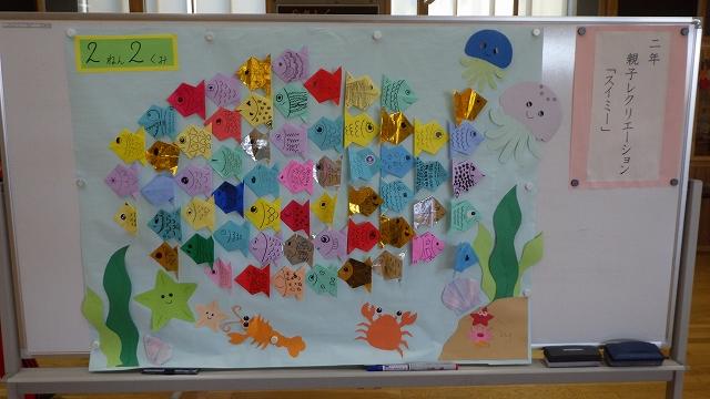 先日、折り紙で作っていただいたスイミーをPTAの方々が一枚一枚貼り付けて大きなスイミーにしてくれました。