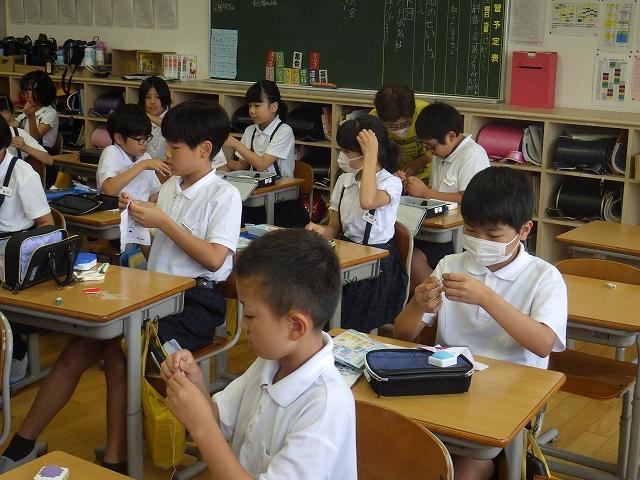 5年生の家庭科では、今裁縫の練習に取り組んでいます。初めて使う道具に戸惑いながらも、玉結びや玉止めを一生懸命練習しています。