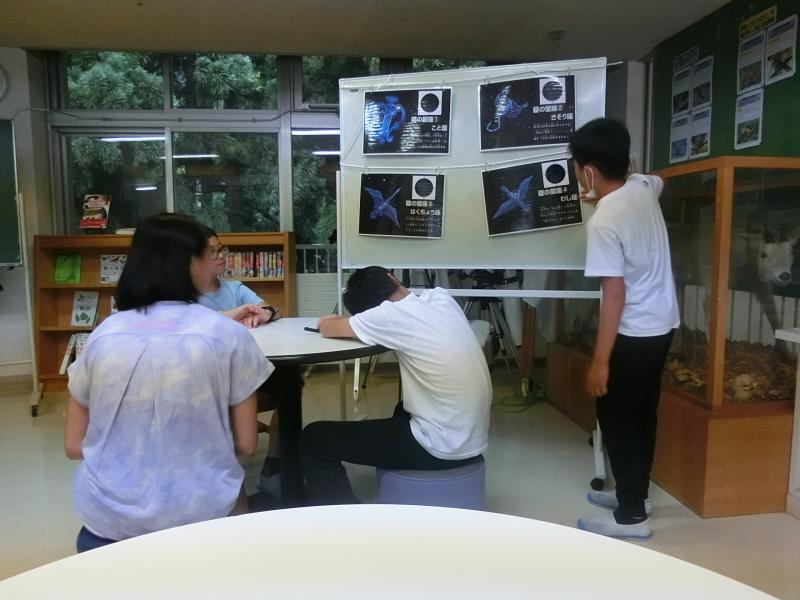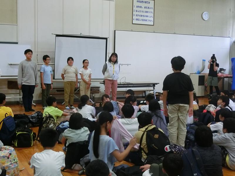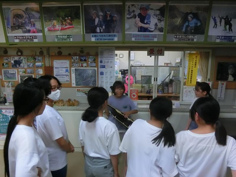 登山を終えた後は合宿所へ向かい入所式を行いました。体験学習を通して”五感を使って自然を体験してほしい”という願いを所長のお話で聴き、どこでどんな風に五感を使っているのか改めて考えていました。自由時間では、所内に展示してあるものや資料を見て過ごしたり、ギターや漫画、昔遊びコーナーで遊んだりなど、児童それぞれ楽しんでいました。