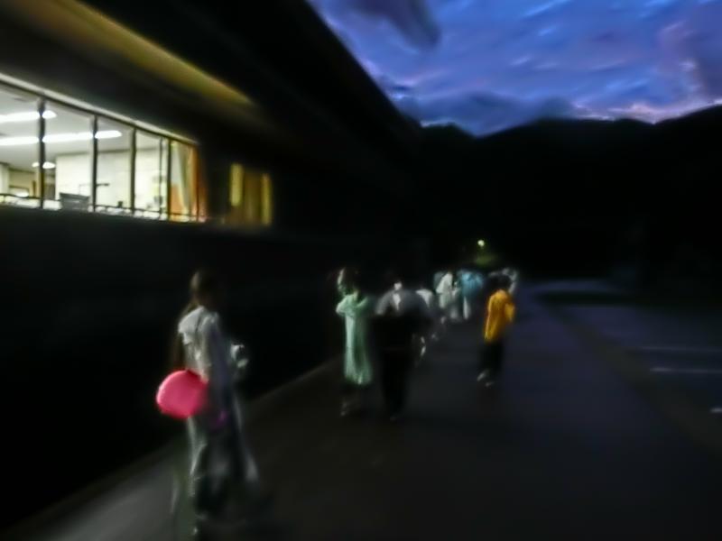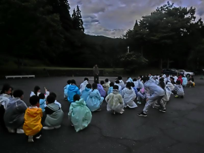 陽が落ちてからナイトゾーンを行いました。児童は、自然を感じながら夜の山道を歩く恐怖心を抱いていましたが、グループみんなで協力して合宿所を目指し、頑張っていました。