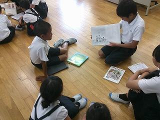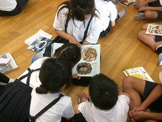 1年生を前にして、初めは、少し緊張した様子でしたが、時間が経つにつれ、ブックトーク以外の場面でも1年生に優しく声をかける姿があり、下級生との関わり方を学んでいました。