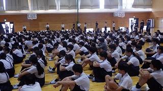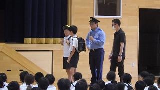 津幡警察署から警察官を招き、実際に校舎内に不審者が侵入した場合を想定した訓練を行いました。