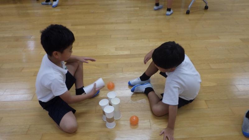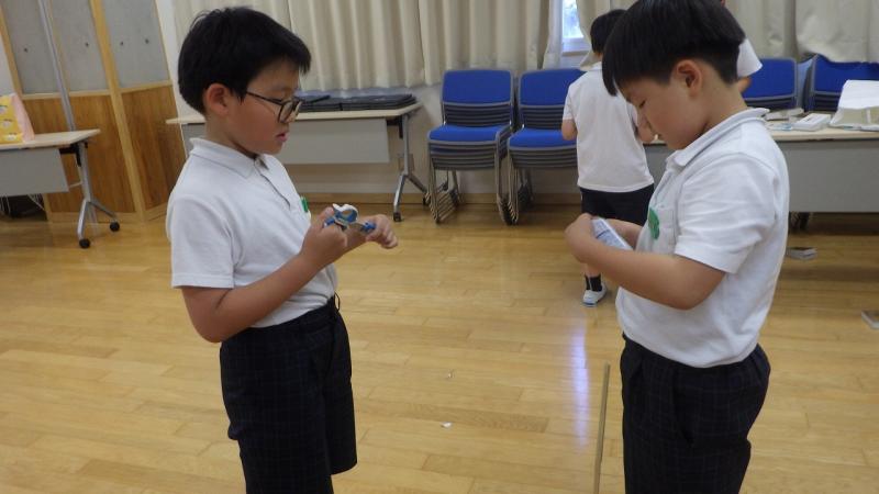 材料の使い方や、転がす、投げる、飛ぶなどの様々な動きを考えておもちゃをつくりました。