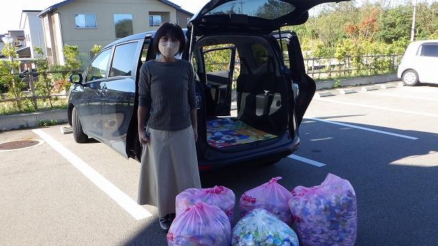集めたエコキャップは、遠く能美市にある企業まで、ボランティアの荒木さんが運んでくださいます。