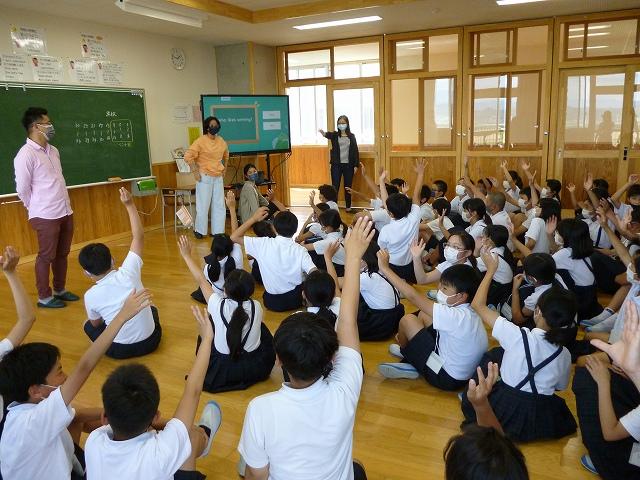 5,6年生とも、グループ交流の後には、シンガポールの方達からお話やクイズをしていただきました。最後にはシンガポールの昔遊びグッズを全員いただき、それらの遊び方を習い、実際に少しだけ遊んでみました。交流が終わった後も熱が冷めず、「またやりたい。」や、「もっと話したい。」との声がたくさんあり、より良い交流となりました。