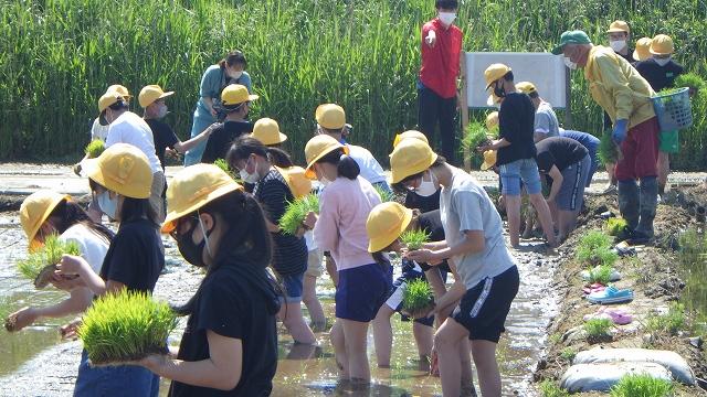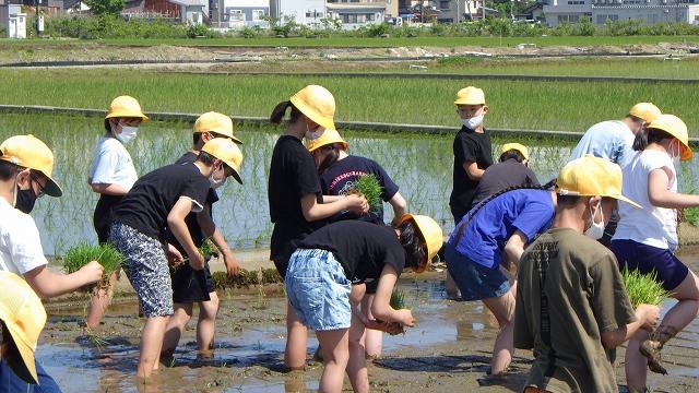 大根布小学校の5年生と一緒にお米作りの名人高道さんに教えていただきながら、苗を植えました。