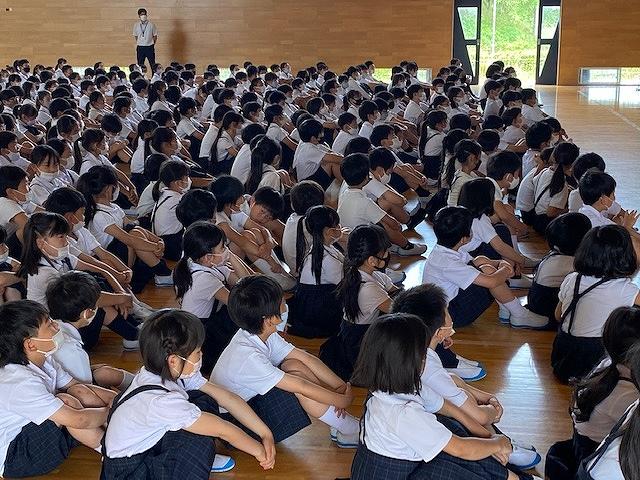 1~4年、6年生は体をゆらしたりリズムをとったりしながら、楽しいリズムや美しい歌声を味わっていました。