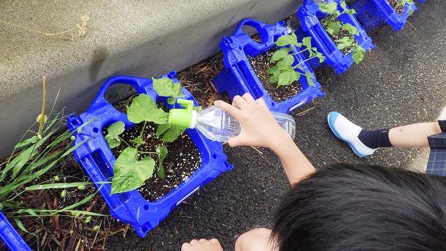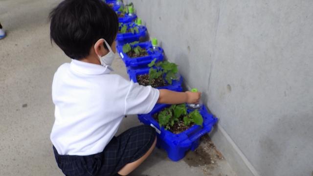 アサガオの間引きをした後の観察の様子です。みんな、自分の花が元気に育っているか毎日欠かさずチェックしています。また、お友達の花も見て「水がほしそうだよ。」「雑草が生えているよ。」と教えてくれます。元気に育ってきれいな花を咲かせますように。