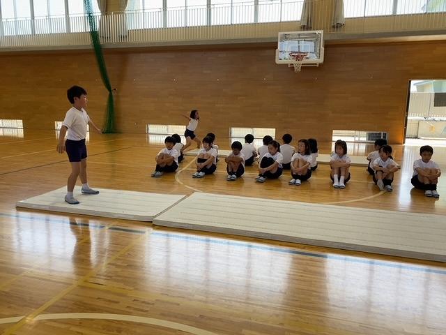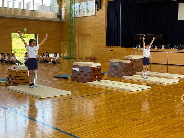 シンとした緊張感のある中で、子どもたちは、体育の授業で練習してきた、マット、鉄棒、跳び箱の技を披露しました。どの子たちも、練習の成果を発揮して、色々な技を披露しました。