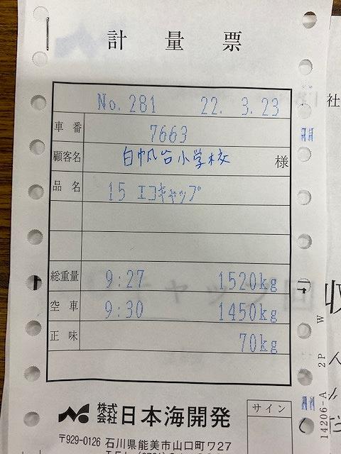 ご家庭から持ってきていただいたエコキャップがたくさんたまったので、ボランティアの荒木さんが、能美市にある業者まで運んでくださいました。