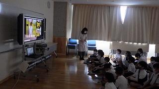 5時間目に歯の健康や歯磨きについてDVDを見ながら勉強しました。丁寧に歯磨きをしたつもりでも6割程度しか汚れがとれていないことや1mgの歯垢の中に細菌が2~3億個いるということを知り、子どもたちは驚いていました。また、コロナ禍ということで、実際に歯磨きはしませんでしたが、手などを歯ブラシに見立て、磨く真似をしながらコツを学びました。