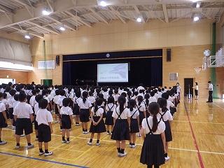 全校一斉に声を合わせて歌うのは初めてです。子どもたちの表情から、楽しみながら歌っていることが伝わりました。