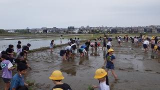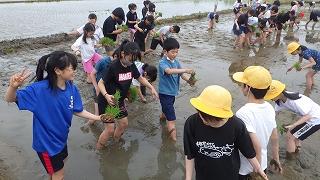 子供たちは、泥に足をとられながらも一生懸命苗を植えていました。