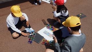 透明のプラスチックパックに色をぬり、太陽の光を当てて、地面に色を映し出す活動をしました。