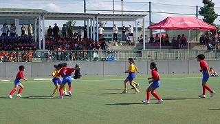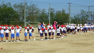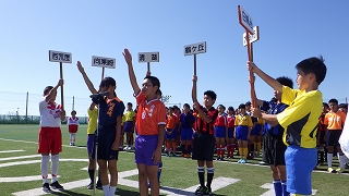 10月3日(水)町のサッカー競技場で、町内6校の6年生による「サッカー交歓会」が行われました。白帆台小学校からも、6年生が5チームに分かれて、町内の小学校と対戦しました。本校の頼もしいリーダー達は、真新しいユニフォーム姿も凜々しく、力一杯芝コートを走り回り、練習の成果を生かしてチームワークよくボールを運び、相手の攻撃を果敢にカットしました。「白帆台強いなぁ!」の声があちこちで聞こえるくらい、5チーム共によく頑張りました。それぞれの試合で、心に残る忘れられないシーンができたと思います。あと半年で同じ中学校に進学する他校の6年生と、共に一つのボールを追いかけ合う貴重なひとときでした。思い出の残る一日になりましたね(写真は選手宣誓・ブルーのユニフォームが白帆台・赤のユニフォームが白帆台です)。