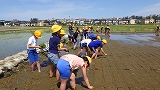 5月21日(月)に田植え体験を行いました。これまでに子どもたちは、地域の方に種植えや苗の世話の仕方を教わり、大切に育ててきました。そして、今回の田植え体験では、代かきの仕方や苗の植え方を教わりました。初めて田植えを経験する児童が多く、初めは裸足で田んぼに入ることに戸惑う様子も見られましたが、すぐに泥の感触にも慣れ、一生懸命苗を植えていました。