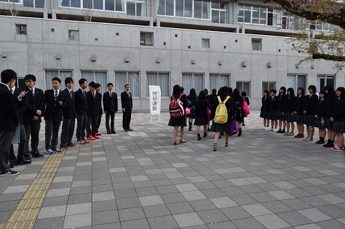 平成28年4月15日(金)登校時、金商リーダー会(各部の主将と副主将)による朝の挨拶運動3日目が行われました。本日は、リーダー会+多数の生徒有志が参加しました。