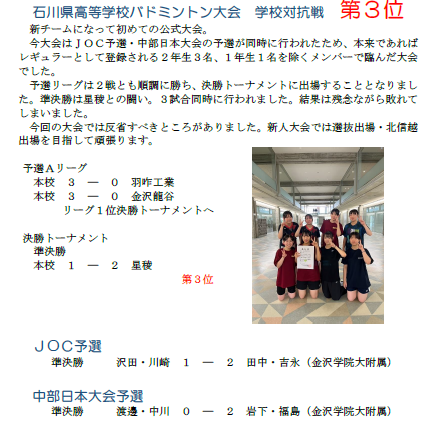 バドミントン部 学校対抗戦、JOC・中部日本大会予選
