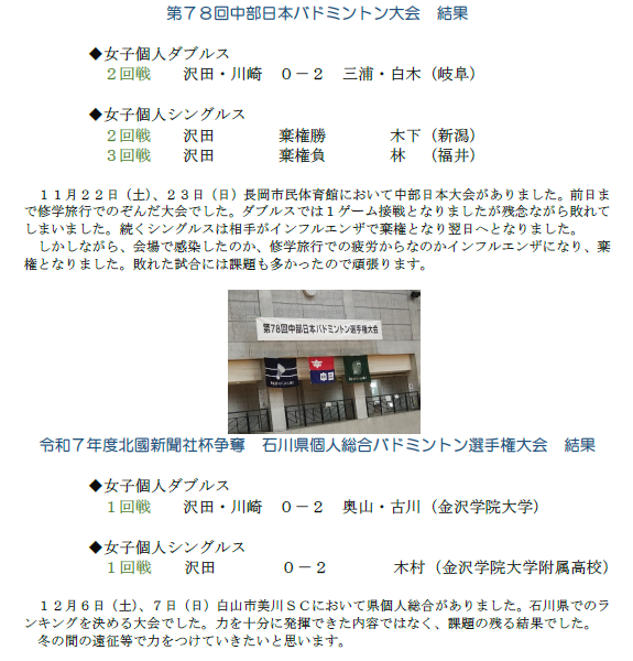 バドミントン部 中部日本大会他 結果