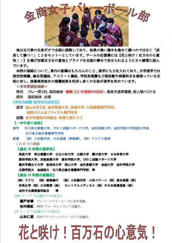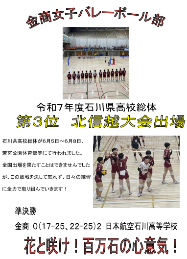 金沢商業高等学校女子バレーボール部は、現在、3年生4人、2年生6人、1年生6人(マネージャーも含む)の計16人で活動しています。
